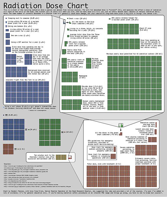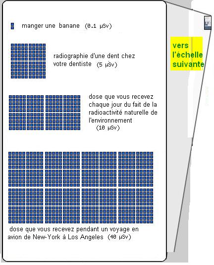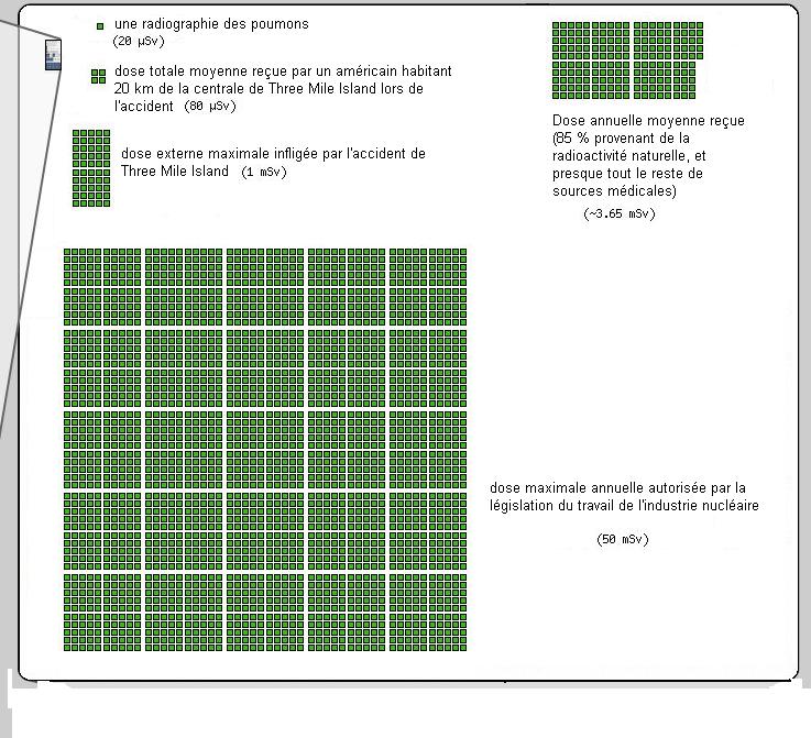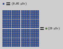 Une pareille dose de 20 μSv (une fois celle que représente ce carré vert) est à peu près celle que vous recevrez pendant une radiographie aux rayons X de vos poumons.