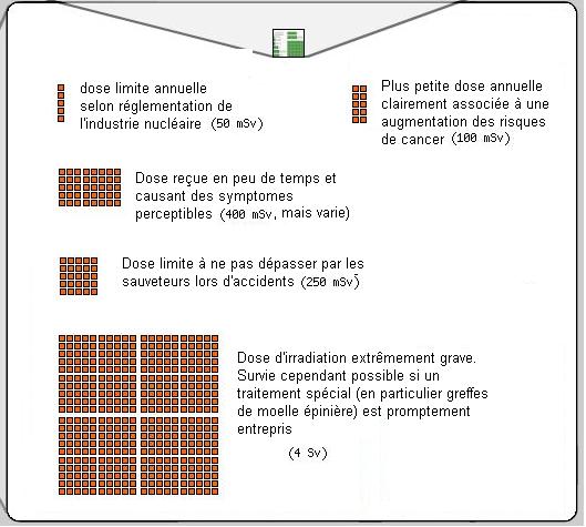La dose de rayonnements ionisants représentée par la surface de ce petit carré orange est de 10 mSv (soit 500 fois 20 μSv). Un technicien exposé professionnellement à des rayonnements ionisants est autorisé légalement à cumuler en une année 5 fois cette dose, soit 50 mSv.
