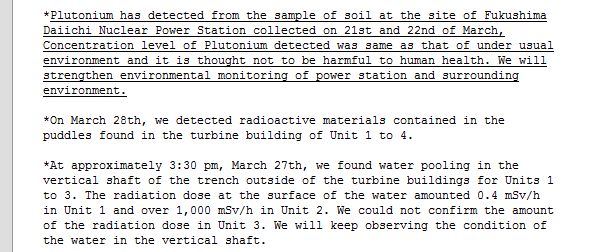 « Du plutonium a été détecté dans des échantillons de sol du site de Fukushima prélevés les 21 et 22 mars. La concentration en plutonium détectée dans ces échantillons était du même ordre de grandeur que celle qui proviendrait d’un environnement normal, et nous pensons qu’elle ne peut pas affecter la santé humaine. Nous allons renforcer les mesures environnementales dans le site lui-même et dans l’environnement qui l’entoure.