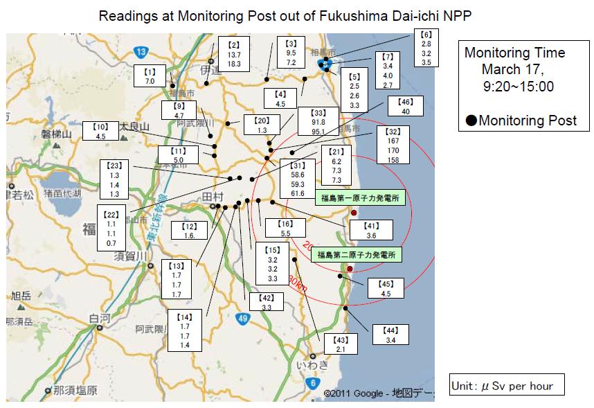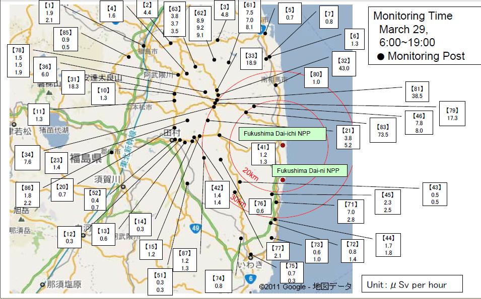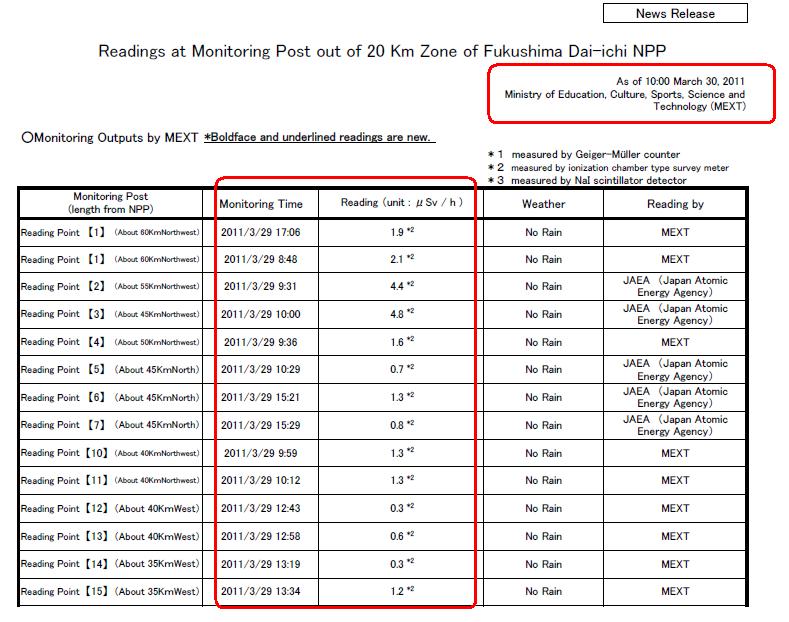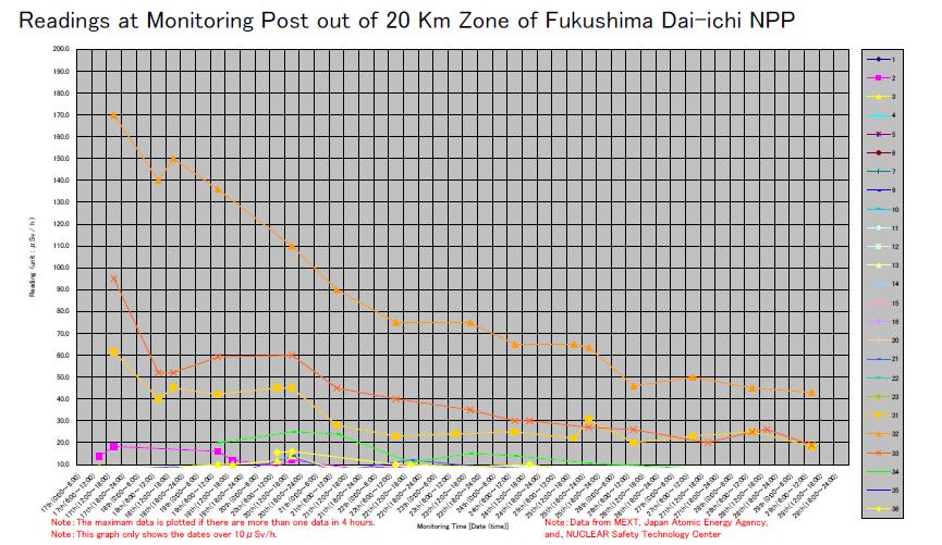 La radioactivité dans l’air à 20 km du site a pour conséquence un débit de dose inférieur à 10 μSv/h (consulter éventuellement cet article) aux endroits et aux moments indiqués.