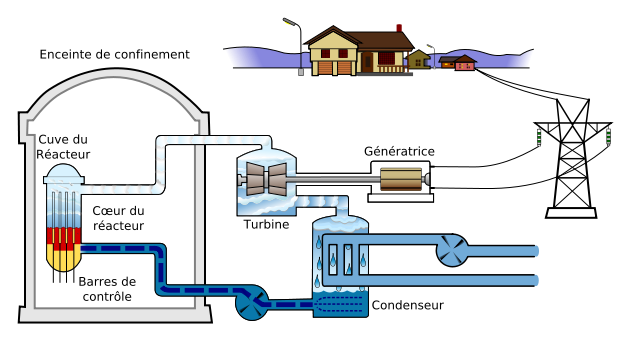 Dans une centrale à eau pressurisée, la vapeur destinée à la turbine est produite dans un générateur de vapeur (GV) contenu comme la cuve-réacteur dans l’enceinte de confinement (Voir le schéma de principe ci-dessous). La chaleur dégagée dans le coeur est acheminée dans le GV (en fait un échangeur de chaleur) via un circuit primaire (représenté en violet sur le schéma), mais l’eau primaire, activée parce que passée dans le coeur, n’ira absolument pas dans la turbine. Elle réchauffe à travers une paroi d’acier une eau secondaire circulant dans un autre circuit (le circuit secondaire) qui lui, alimente la turbine en vapeur (en rouge sur le schéma), puis opère le retour au GV de la vapeur condensée en eau (en bleu sur le schéma) après qu’elle ait cédé son énergie à la turbine.