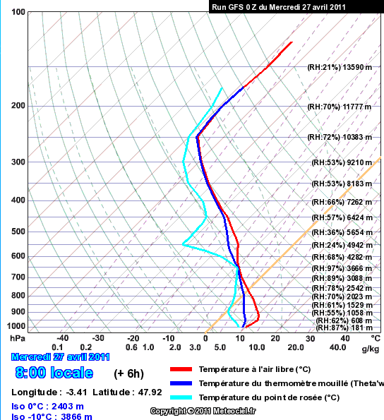 Cette figure nous fournit les mêmes résultats que si à 8 h ce matin, nous avions largué à Vannes un ballon -sonde qui serait monté jusqu’à 11000 m d’altitude tout en transmettant des mesures de son altitude, de la température, de la pression, et de la teneur en eau de l’atmosphère. La courbe rouge donne la température de l’atmosphère en fonction de l’altitude. On voit qu’elle est toujours à droite d’une courbe vert jade qui donne la température du point de rosée, c’est-à-dire de la température à laquelle il faut refroidir l’air à la pression du moment pour qu’apparaisse la première goutte liquide par suite de la condensation de la vapeur d’eau. Le diagramme montre que cela n’arrive jamais, sauf à une altitude bien localisée, environ 3670 m. En dessous, et au dessus de cette couche particulière, il n’y a pas d’eau sous forme de gouttelettes liquides, donc pas de nuages (la vapeur d’eau étant invisible). C’est bien ce que montre la photo prise à 8 H.