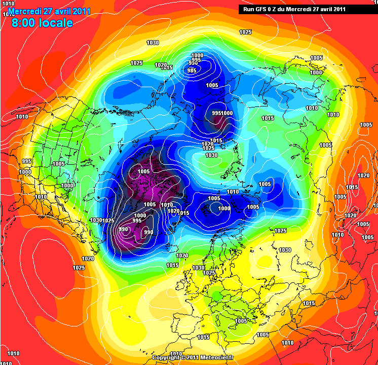 La carte ci-dessus a été préparée et éditée sur internet à partir des données brutes américaines par un autre organisme bénévole dont vous pouvez également visiter de site: http://www.meteociel.fr/. Cette carte représente l’ensemble de l’hémisphère Nord de la Terre, comme si vous l’observiez à partir d’un satellite géostationnaire positionné à la verticale du pôle Nord.