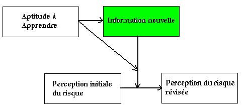 On peut dire que la manière dont une personne est capable de réviser sa perception d’un certain type de risque va dépendre de ses aptitudes à apprendre, ce qui en l’occurrence consistera en ses motivations et ses capacités à découvrir de nouvelles informations, à les reconnaître comme telles, et à leur accorder un effet sur ce qu’est sa perception de la question en accord avec la pertinence de l’information nouvelle. Ce qu’on peut résumer par le schéma suivant, dans lequel le processus bayesien d’apprentissage met en œuvre une variable exogène, figurée en vert: