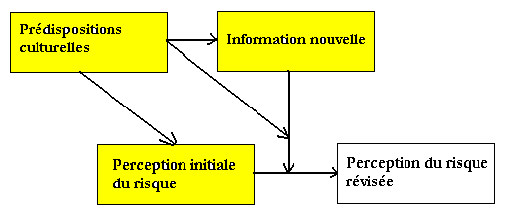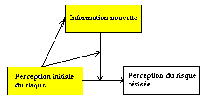 S’il s’avère que l’aptitude à apprendre de la personne est guidée par ses perceptions existantes, c’est-à-dire si sa recherche d’informations nouvelles est orientée de telle manière à privilégier les informations qui viendront conforter sa perception initiale du risque, alors cette personne va développer une attitude caractérisée par l’étroitesse de vues. Le processus d’acquisition d’information de type bayesien ne fonctionnera plus, car il n’y a plus de variable exogène, disparue et remplacée par une variable endogène figurée en jaune:
