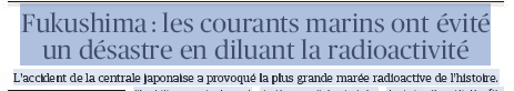 Et bien, un bonne nouvelle nous parvient enfin. Les mesures de radioactivité faites en juin 2011, c’est-à-dire trois mois après que la source de pollution ait commencé à débiter, par le navire océanographique américain Kaimikai-o-Kanaloa, montrent que les courants marins particulièrement puissants dans cette partie de l’océan ont réussi à diluer les polluants dans l’immensité marine de manière telle que les concentrations en radionucléides sont redescendues au dessous des valeurs considérées comme dangereuses pour l’homme et les animaux marins. Et bien entendu, ce processus de dispersion ne peut que continuer à améliorer la situation, car les concentrations observées sont encore deux ou trois fois supérieures dans tout l’océan pacifique à celles observées avant la catastrophe.