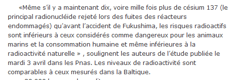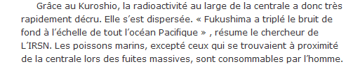 « Dans un rayon de 20 km autour de la centrale, on trouve des « points chauds » où la radioactivité des sédiments marins atteint 5 000 becquerels par kilo (Bq/kg). Et des niveaux de contamination très supérieurs à la limite tolérée, qui est de 100 Bq/kg, sont encore observés chez certains poissons, notamment parmi les espèces vivant au fond de l’océan (poissons plats, congres, grondins, raies…).