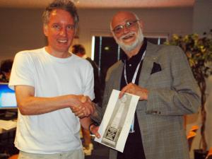 Voici Gianarrigo Rona (à droite), le président de la WBF, Fédération Mondiale de Bridge, remettant le trophée officiel à Hans Kuijf, le développeur de Jack, secondé par Wim Heemskerk et Martin pattenier.