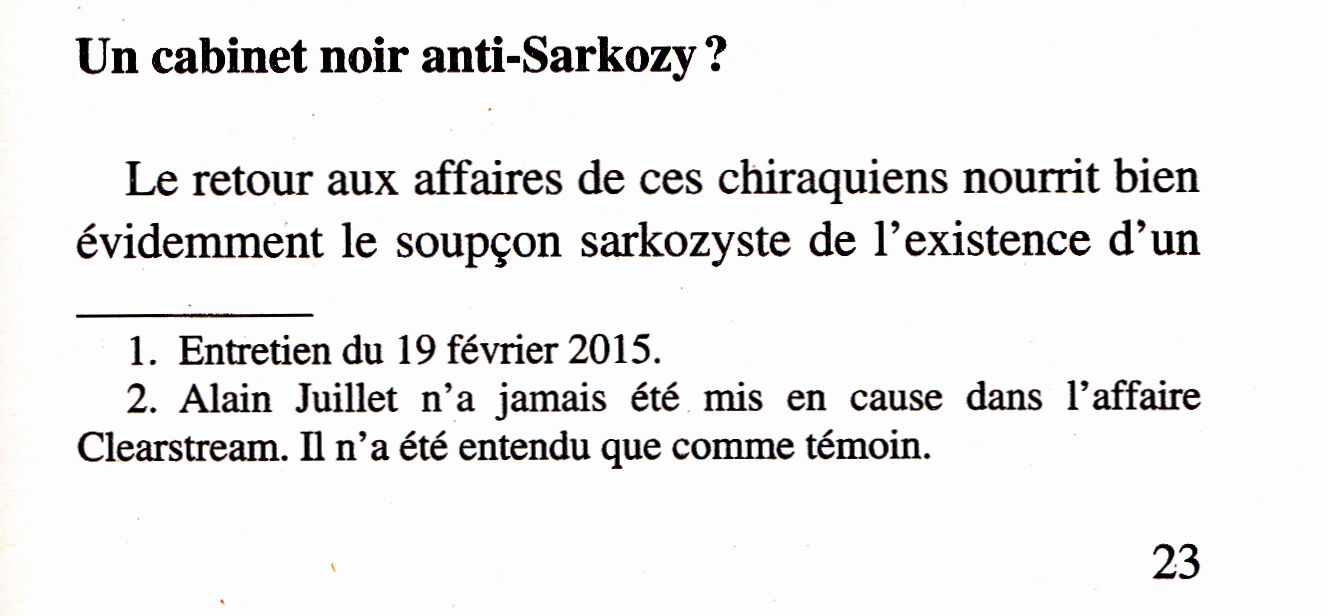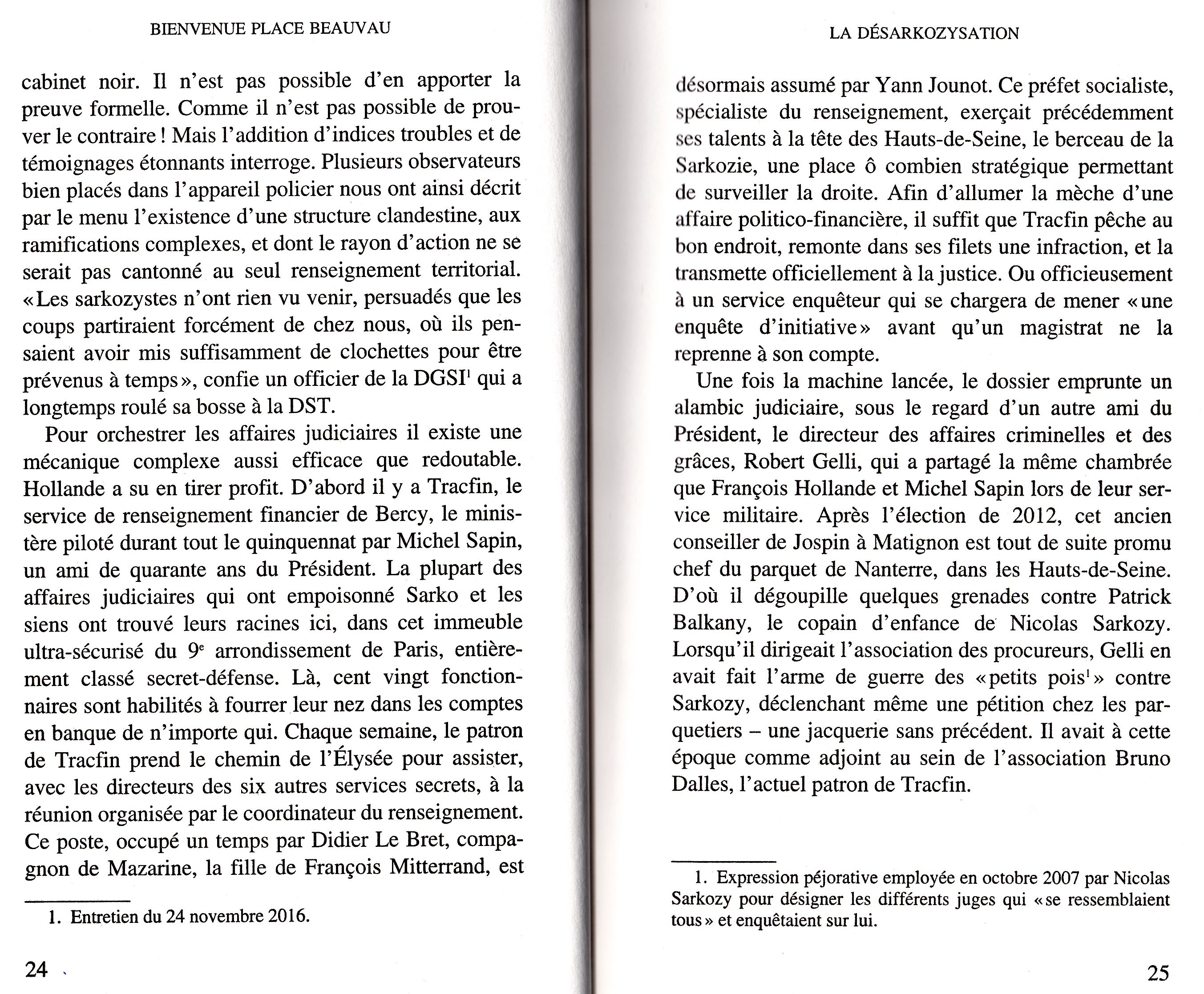 Voici ci-dessous la reproduction des pages 23,24, 25 du livre, qui sont de nature à vous faire mieux comprendre certaines des paroles prononcées par François Fillon. Vous y trouverez par exemple la définition du sigle Tracfin, vous constaterez que la paternité de l’expression ‘cabinet noir’ doit être attribuée, non à Fillon, mais aux auteurs du livre, vous pourrez mieux apprécier dans quelle mesure François Fillon a eu raison d’évoquer l’éventualité d’une « illégalité totale » si « les allégations portées dans ce livre » sont confirmées par l’enquête qu’il demande.