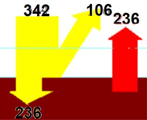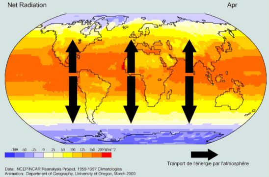 Comme le montre ce petit schéma, le bilan est évidemment nul pour l’ensemble du globe ( Ce n’est pas sur une seule année moyenne que, heureusement, on peut mettre en évidence un effet de réchauffement ou de refroidissement climatique ) . C’est donc que les bilans thermiques — plus de 300 W/m2 absorbés dans la zone équatoriale contre seulement 70 dans les hautes latitudes polaires — doivent s’équilibrer par des transferts méridiens entre l’équateur et les pôles. C’est là l’origine des mouvements de fluides atmosphériques et océaniques.