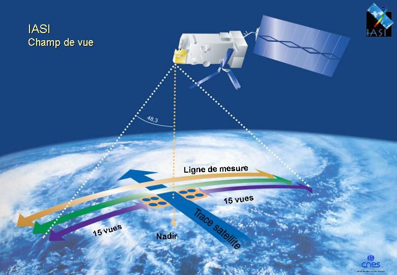 IASI , l’Interféromètre Atmosphérique de Sondage dans l’Infrarouge embarqué dans chaque satellite, permet d’obtenir deux fois par jour sur la totalité de la surface de la Terre le profil vertical de la température, de l’humidité et des concentrations de différents gaz (CO, CH4, NO2, O3, etc). Son spectromètre mesure le rayonnement infrarouge dans la bande 3,6 à 15 m , avec une visée au nadir.