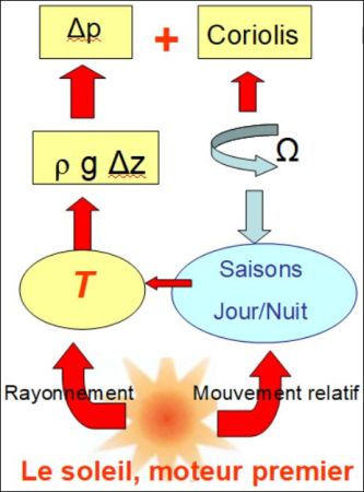 À gauche est représentée la chaîne de causes et de conséquences qui conduit à l’existence de différences de pression dans l’atmosphère, qui sont les moteurs des grands mouvements de l’air atmosphérique :