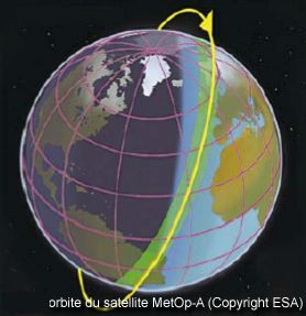 C’est ainsi que les trois satellites MetOp , lancés en 2006, 2010, 2015, tournent autour de la Terre sur une orbite quasi circulaire passant près des pôles, à une altitude de 840 km environ. Il font le tour de la Terre en 100 minutes :