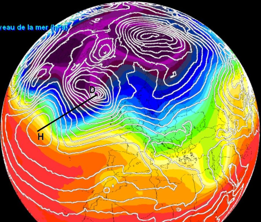 L’affrontement anticyclone – dépression marqué par la ligne noire HD est énorme : 1035 hPa au point H, centre de l’anticyclone des Açores, faisant face aux 960 hPa seulement, au centre de la dépression D au voisinage de l’Islande .