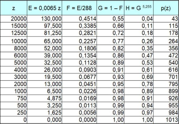 Le tableau suivant exécute ce calcul de p(z) pour les altitudes z = 0 jusqu’à z = 20000 m