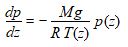 Malheureusement, si l’intégrale du premier membre est évidente – Log p(z) — le second membre n’est pas intégrable, puisque comportant la fonction inconnue T(z). Force est donc, si on désire parvenir à exprimer une distribution de la pression atmosphérique en fonction de l’altitude, d’adopter une distribution de température T(z) vraisemblable.