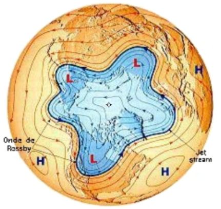 Ce que montre cette carte, c’est la séparation de l’atmosphère de l’hémisphère Nord en deux grandes zones séparées par une frontière oscillante très semblable à celle que l’expérience de laboratoire décrite plus haut avait mise en évidence. Cette frontière s’appelle le front polaire , et ce front est en fait un système oscillant, entraîné d’Ouest en Est par la rotation de la Terre . Les ondes constituant ce système ont été nommées des ondes de Rossby . Ces ondes séparent ainsi des zones anticycloniques de hautes pressions, au sud, et des zones cycloniques de basses pressions, au Nord.