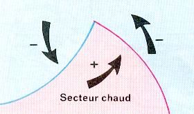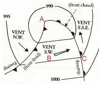 Le centre de la dépression associée (pression la plus basse) s’observe en A au sommet du secteur chaud.