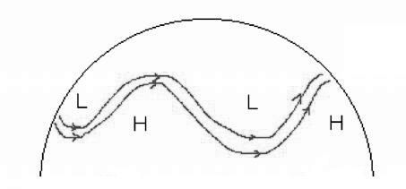 C’est de cette opposition de mouvements en sens contraires que naît l‘ondulation du front polaire, qui va être entraînée dans le flux général d’Ouest en Est .