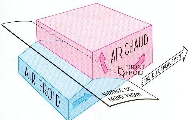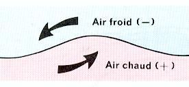 À l’arrière ( sur la gauche) , l’air froid (en bleu) remplace l’air chaud : C’est la surface de front froid .