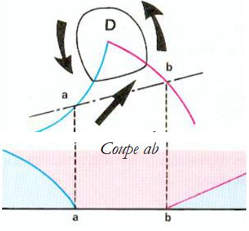 Il se forme ainsi un tourbillon dépressionnaire, et la surface frontale se sépare en deux parties, comme montré ci-dessous sur la coupe a-b par un plan vertical :