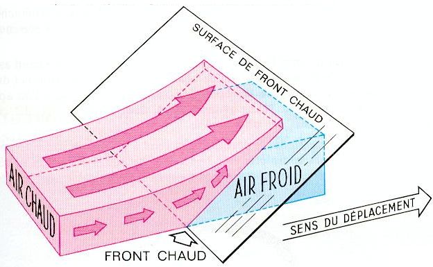 À l’avant ( sur la droite du schéma ci-dessus) l’air chaud (en rouge) remplace l’air froid : C’est la surface de front chaud .