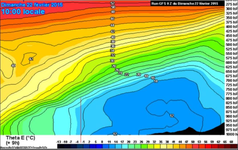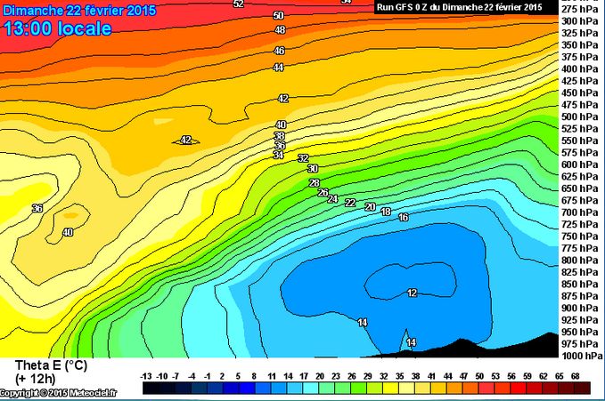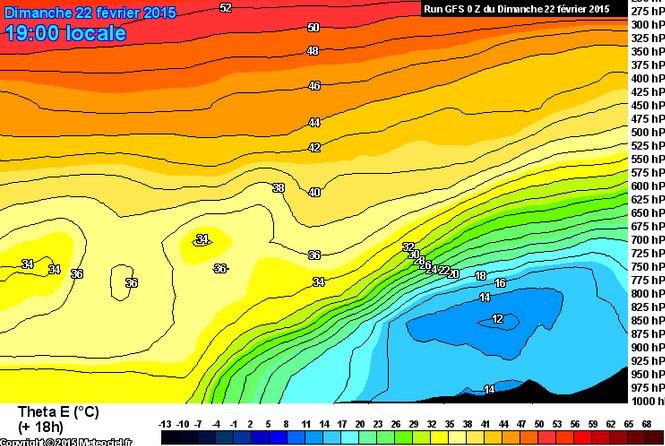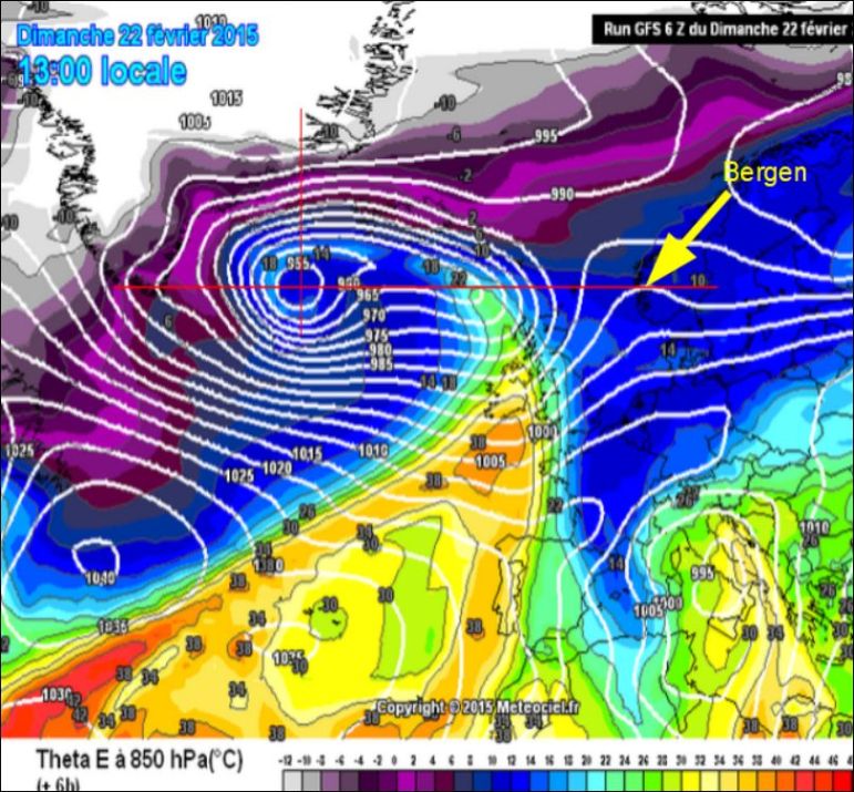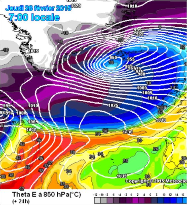 Le troisième facteur favorable est un fort réservoir d’énergie potentielle. La carte ci-dessous, 24 heures avant que la formation de la perturbation ait été vraiment déclenchée, montre des lignes iso-Theta E très serrées, affichant des valeurs très élevées supérieures à 40°C, dans de l’air à -20° -30°C (Attention ! les 40 °C représentent une quantité d’énergie potentielle, qui n’est pas là sous forme de chaleur vive ) :
