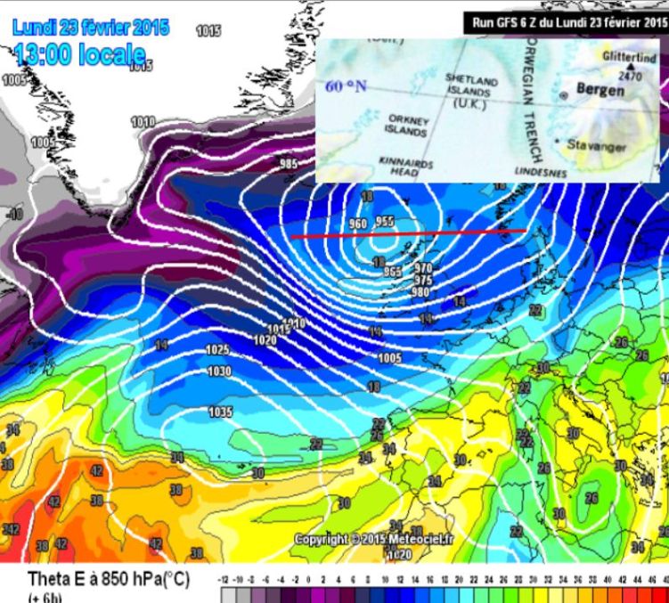 Cette carte classique montrant la distribution de température potentielle équivalente Tetha E à 850 hPa nous montre une dépression assez impressionnante à 956 hPa s’apprêtant à aborder l’Irlande puis la Manche . On y reconnaît le front chaud qui vient d’aborder la Bretagne, et le front froid se déployant jusque dans l’Ouest des Açores. Son centre est à peu près à la latitude de Bergen, soit 60°N .