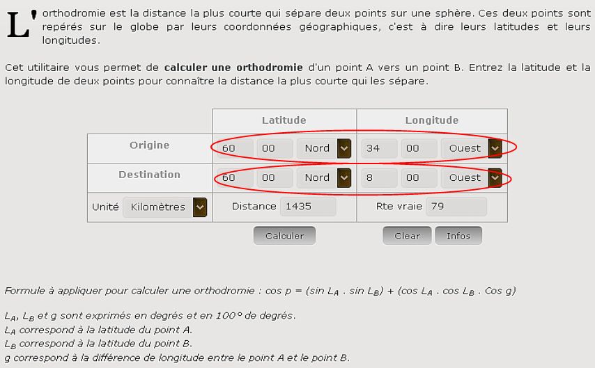 Cette application Java disponible sur le site internet http://aero-training.fr permet de calculer la distance orthodromique entre deux points. Ce qui nous donne la distance parcourue par le centre de la dépression en 24 heures : 1435 km .