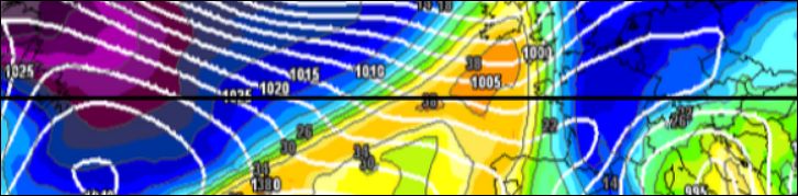 Pour découvrir plus en détail les caractéristiques d’une perturbation atlantique type telle que celle-ci, nous allons utiliser la capacité des modèles numériques à présenter des coupes verticales dans la partie d’atmosphère représentée :