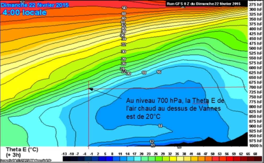Vers 19 h, on peut considérer que la trace du front chaud sur le sol a atteint la longitude de Vannes. Désormais, la Théta E a atteint sa valeur maximale à ce niveau de 700 hPa, et n’augmentera plus :