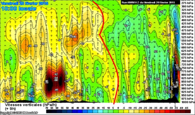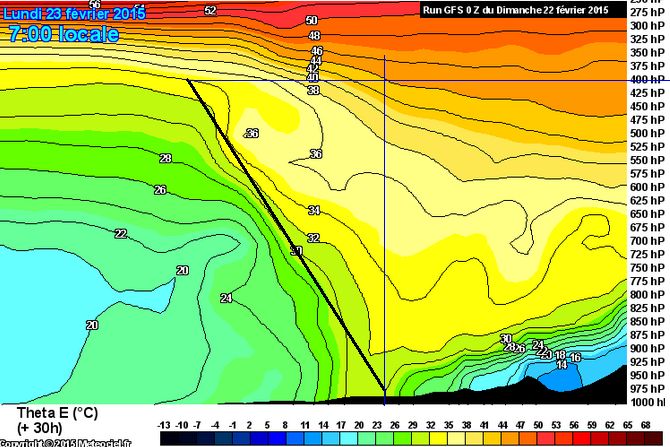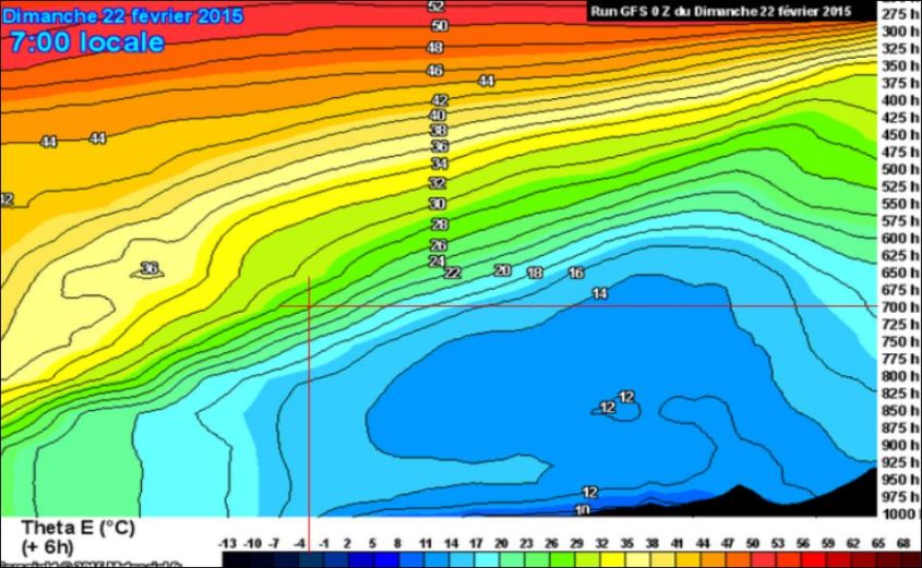 On peut estimer la vitesse de progression vers l’Est du front chaud en constatant qu’en 3 heures (entre 4 et 7 H heure locale), la Théta E au niveau 700 hPa est passée de 20 à 26°C, soit un gain moyen de chaleur de +2 °C par heure. Sur la coupe, c’est une progression que l’on peut estimer grossièrement à 40 km/h .