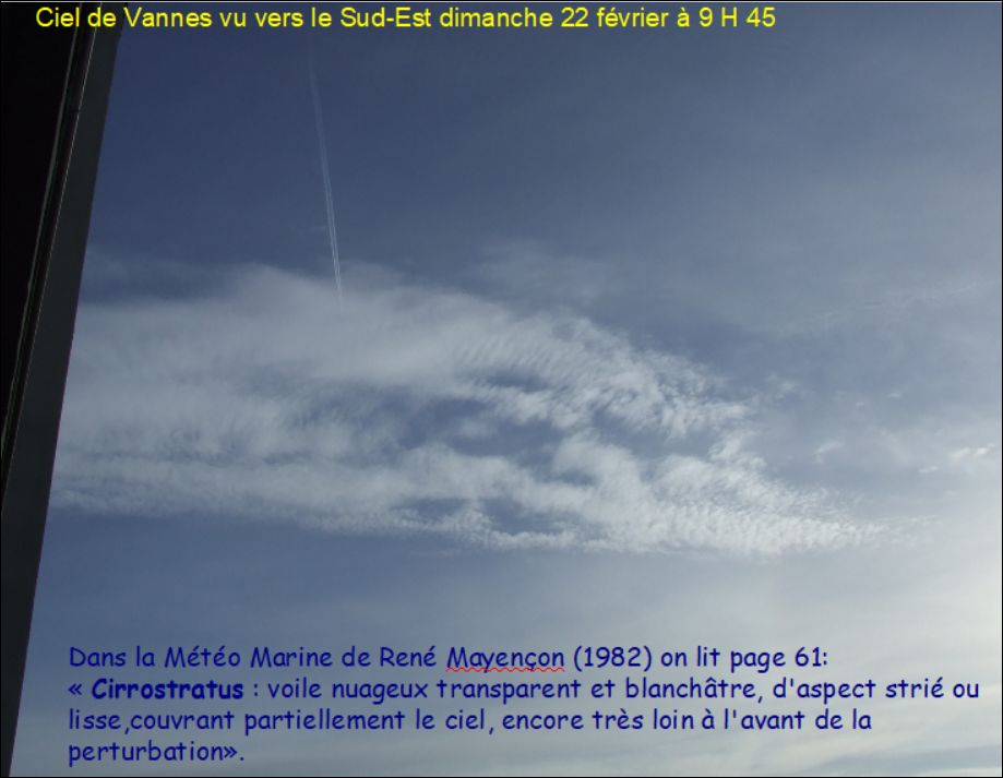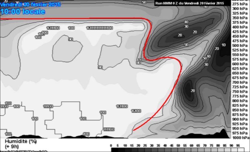 La coupe verticale suivante est prévue par le modèle à peu près au moment où l’on a observé dans le ciel de Vannes (vers le SSE) des cirrostratus (voile ténu, couvrant une partie du ciel, d’aspect strié, fibreux ou uniforme) annonçant la pluie quelques heures plus tard :