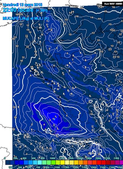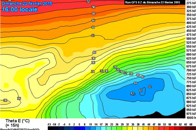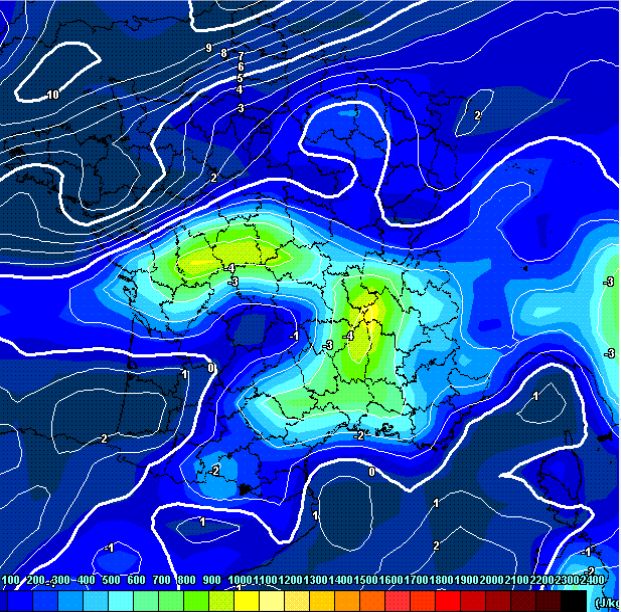 Le coloriage donne la CAPE (énergie totale potentiellement disponible pour un orage). Tant qu’on est dans le bleu foncé, pas de risque