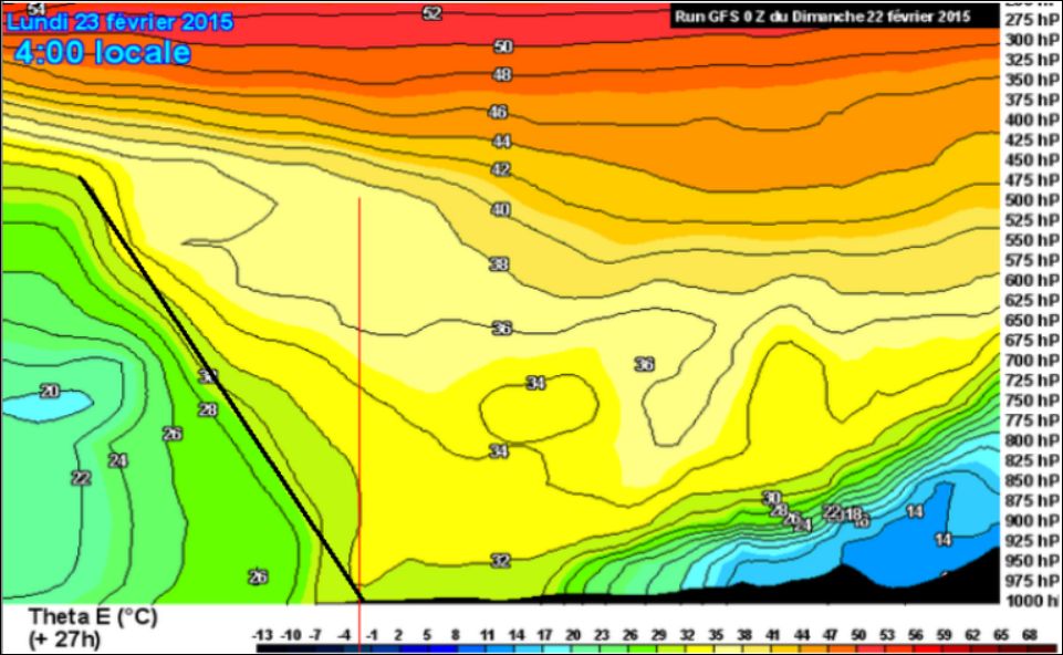 Pour remonter un peu plus dans le temps (ici, 4 H heure locale, soit 3 heures avant le lancement du calcul avec les sorties duquel on a effectué les coupes qui vont être montrées ci-dessous , on a utilisé la faculté qu’offre le site Météociel de consulter les archives de GFS.