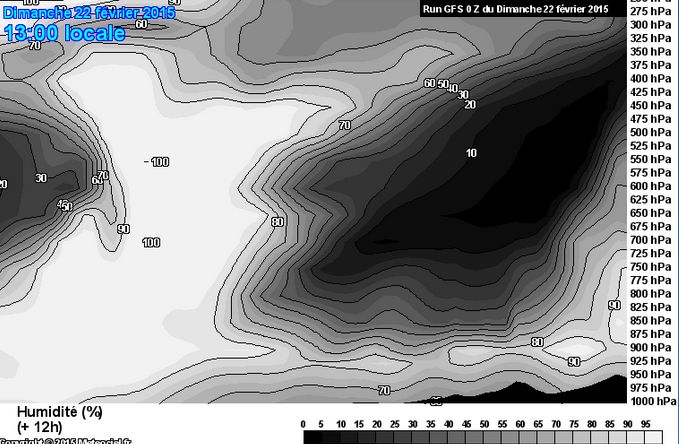 Attention au code de dégradés noir vers blanc adopté par GFS : le noir correspond à un air complètement sec et le blanc à 100 % d’humidité . Cette coupe montre donc qu’à 13 H, l’air saturé d’humidité est encore localisé au proche Atlantique, mais qu’au-dessus de Vannes, l’humidité de l’air ne dépasse pas 70 à 80 % . Il ne pleut donc pas à Vannes à 13 heures .