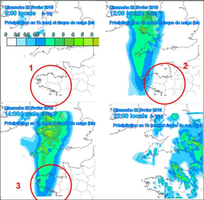 Revenons maintenant en arrière, vers dimanche 22 février, 13 Heures. Pour nous intéresser à la prévision de précipitations , un sujet délicat que nous n’avions encore jamais abordé :