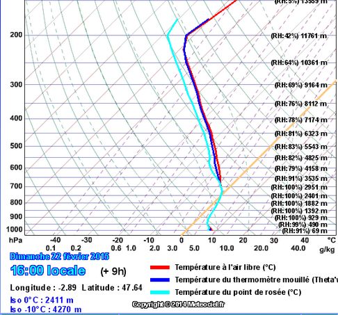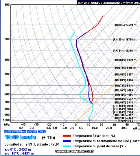 Ces cartes montrent sur le Morbihan un épisode pluvieux débutant un peu après 14 heures et prenant fin vers 22 heures . Il est indispensable de conforter ces prévisions dont la fiabilité est incertaine ( du fait de la difficulté à décrire le phénomène souvent trop localisé pour la résolution des modèles) par l’examen de sondages verticaux de l’atmosphère. De tels sondages sont présentés ci-dessous, pour Vannes :