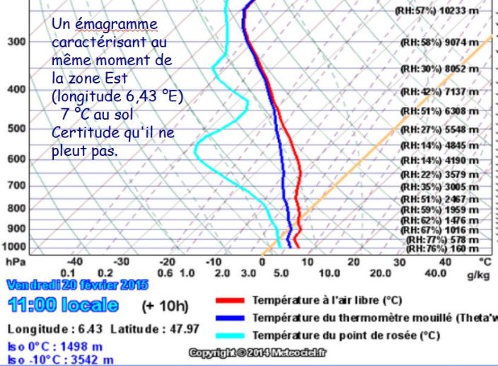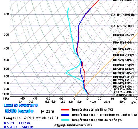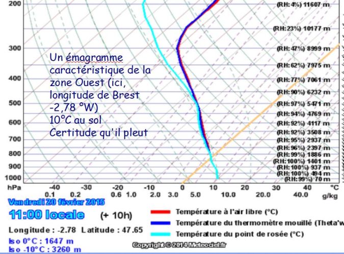 L’anomalie de point de rosée vers 3500 m d’altitude que l’on observe sur l’émagramme est évidemment à rapprocher du passage du front froid à la verticale de Vannes, qui vient d’avoir lieu ou qui va avoir lieu :