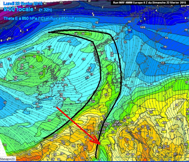 Normalement maintenant, la suite doit nous montrer que le temps va s’améliorer . Et c’est la carte suivante, sortie du modèle NMM avec une résolution 10 fois plus fine que le modèle GFS précédent (soit 100 fois plus de mailles), qui confirme que le Morbihan en a bien fini avec cette perturbation là, grâce à la remontée d’une belle masse d’air à la Théta E signifiant du beau temps :