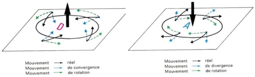 C’est l’effet combiné de ces trois facteurs qui explique la mise en rotation de l’air dans le plan horizontal . Et c’est cette rotation qui va, en s’amplifiant, créer le centre de la dépression, et un tourbillon vertical :