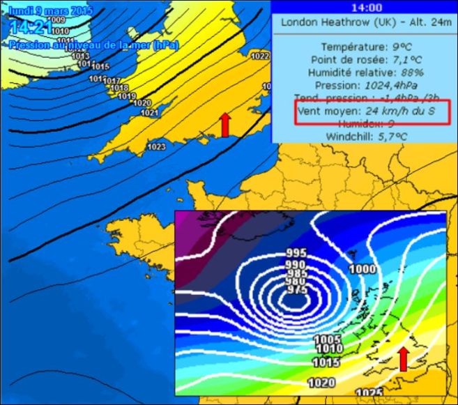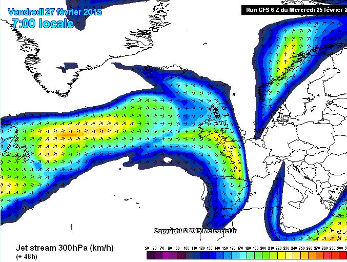 La carte ci-dessus montre le jet stream à 9000 mètres d’altitude, orienté plein Est à plus de 200 km/h . C’est le premier facteur .