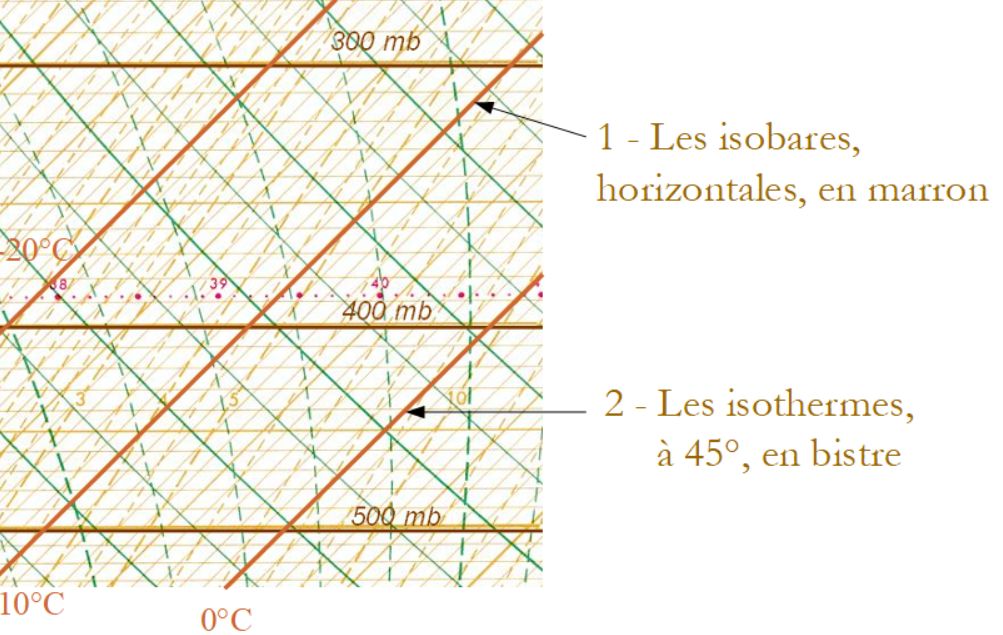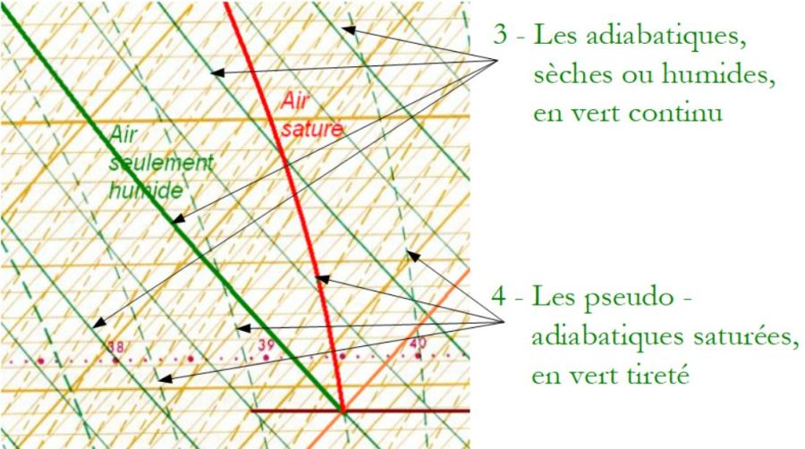 Les deux réseaux de lignes suivants, parmi ces cinq, sont les adiabatiques (sèches ou humides) et les pseudo-adiabatiques saturées :