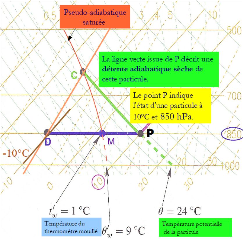 Enfin, on a tracé en rouge la pseudo-adiabatique saturée issue de C. Elle coupe DP en M . Ce point M indique la température du thermomètre mouillé.