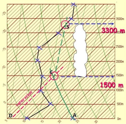 Cependant, le moteur B ralentit au fur et à mesure que l’écart Tp – Te diminue . Et de fait, cet écart va s’annuler au point S du diagramme, intersection de la pseudo-adiabatique saturée verte pointillée donnant Tp et de la courbe d’état noire donnant Te . Le diagramme nous dit que l’on est alors à l’altitude de 3300 m . Ce sera le sommet du cumulus .