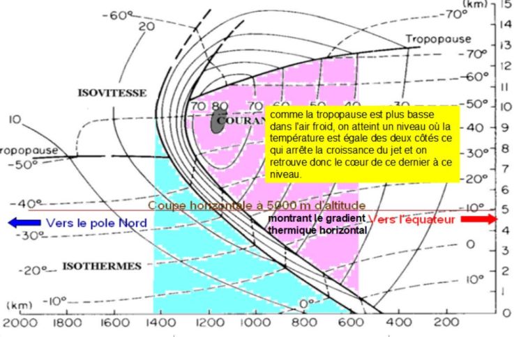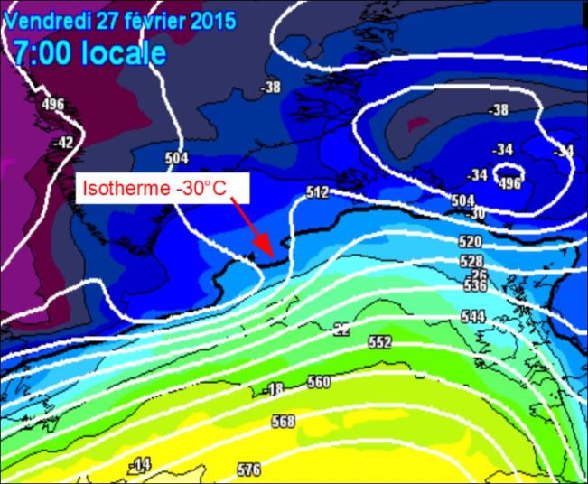 Le second facteur est un fort gradient horizontal de température. Sur la carte ci-dessous, la courbe en noir est l’isotherme -30°C à l’altitude de 5500 m (500 hPa). On constate qu’elle délimite nettement une zone Nord froide (de -30°C à -42°C) , par rapport à une zone Sud chaude (-14°C à -30°C) :