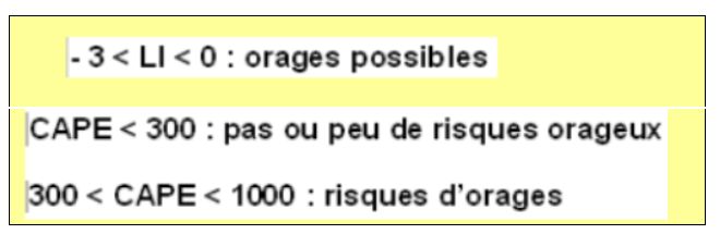 Un orage se formera si on a À LA FOIS les deux conditions suivantes réunies : CAPE > 300 J/kg et L.I < 0