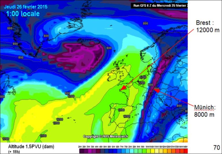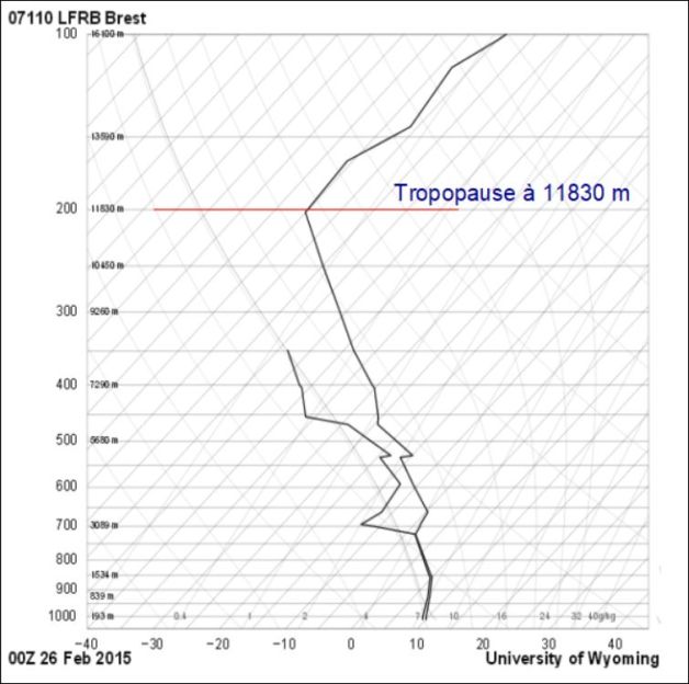 Le radiosondage effectué à la même heure (01 H locale) le jeudi 26 février par la station de Brest Guipavas confirme parfaitement l’altitude de 12000 m à laquelle le modèle GFS situe la tropopause, au moyen du tourbillon potentiel de valeur 1,5 pvu :