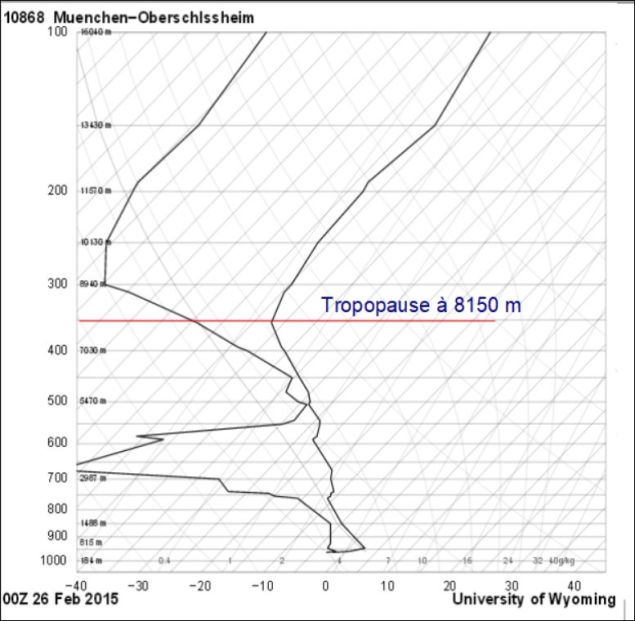 La confirmation du résultat du modèle GFS est la même pour le radiosondage effectué au même moment à Münich où la tropopause est localisée à l’altitude de 8150 m (350 hPa) :