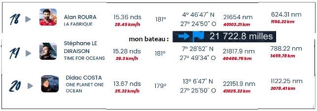 Cette carte montre qu’en dépit de mon retard initial, je précède néanmoins 7 ou 8 skippers qui participent eux à la course réelle ( Ils sont repérés par des symboles orangés ) . Je les ai identifiés hier à partir des données publiées sur le site officiel du Vendée Globe . Voici le repérage que j’en ai fait :